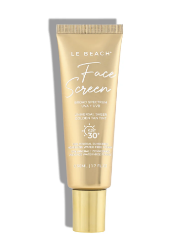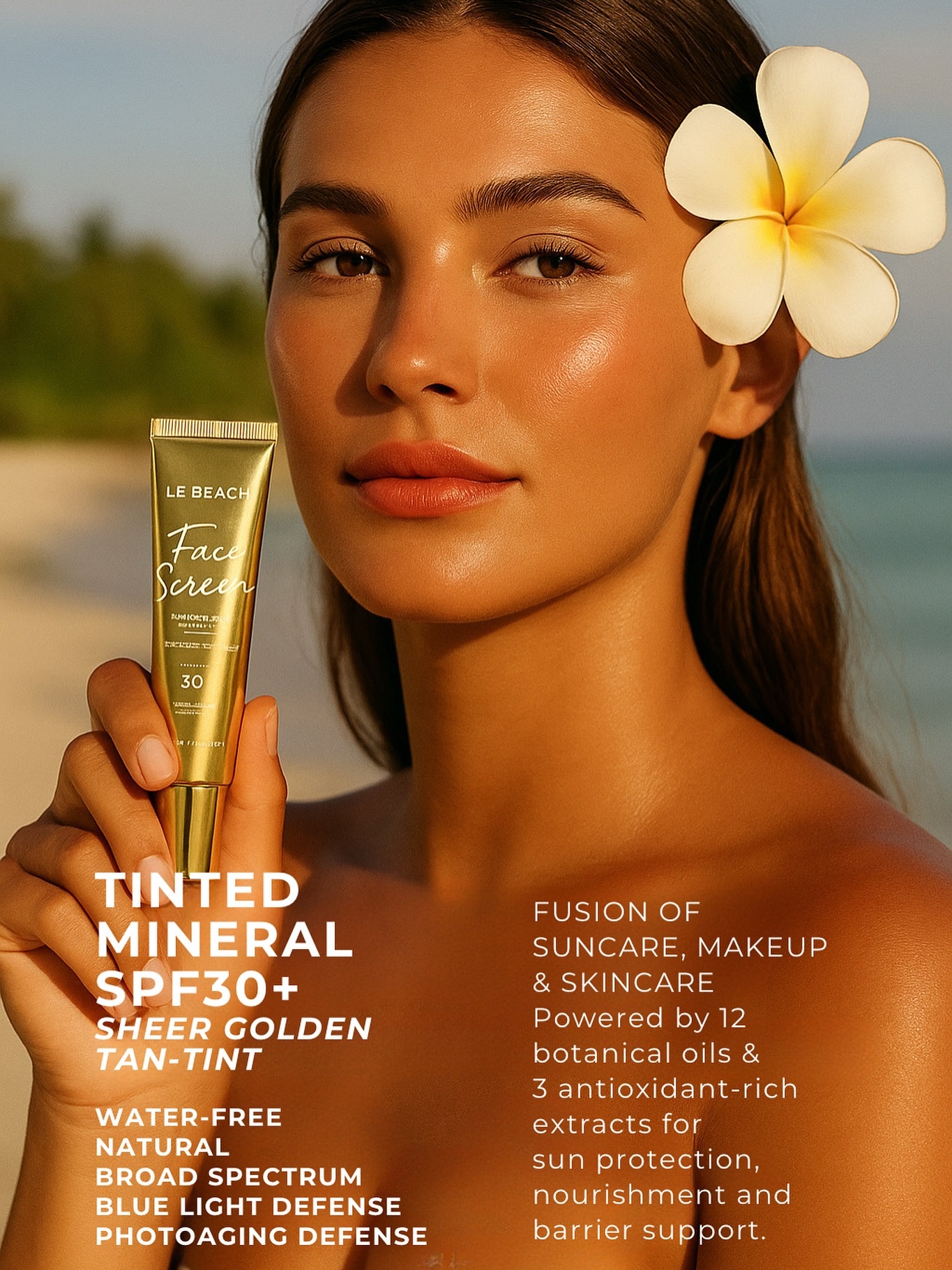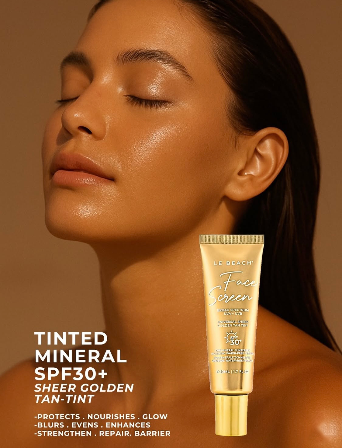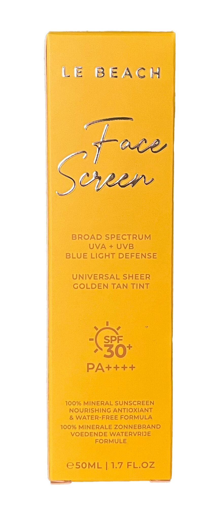 Face Screen SPF30+ Getint is een 3-in-1 skincare essential: een minerale zonnebrand met breedspectrum SPF30+, een voedende huidverzorging zonder water en een subtiele gouden tint die zich aanpast aan de meeste huidtinten.