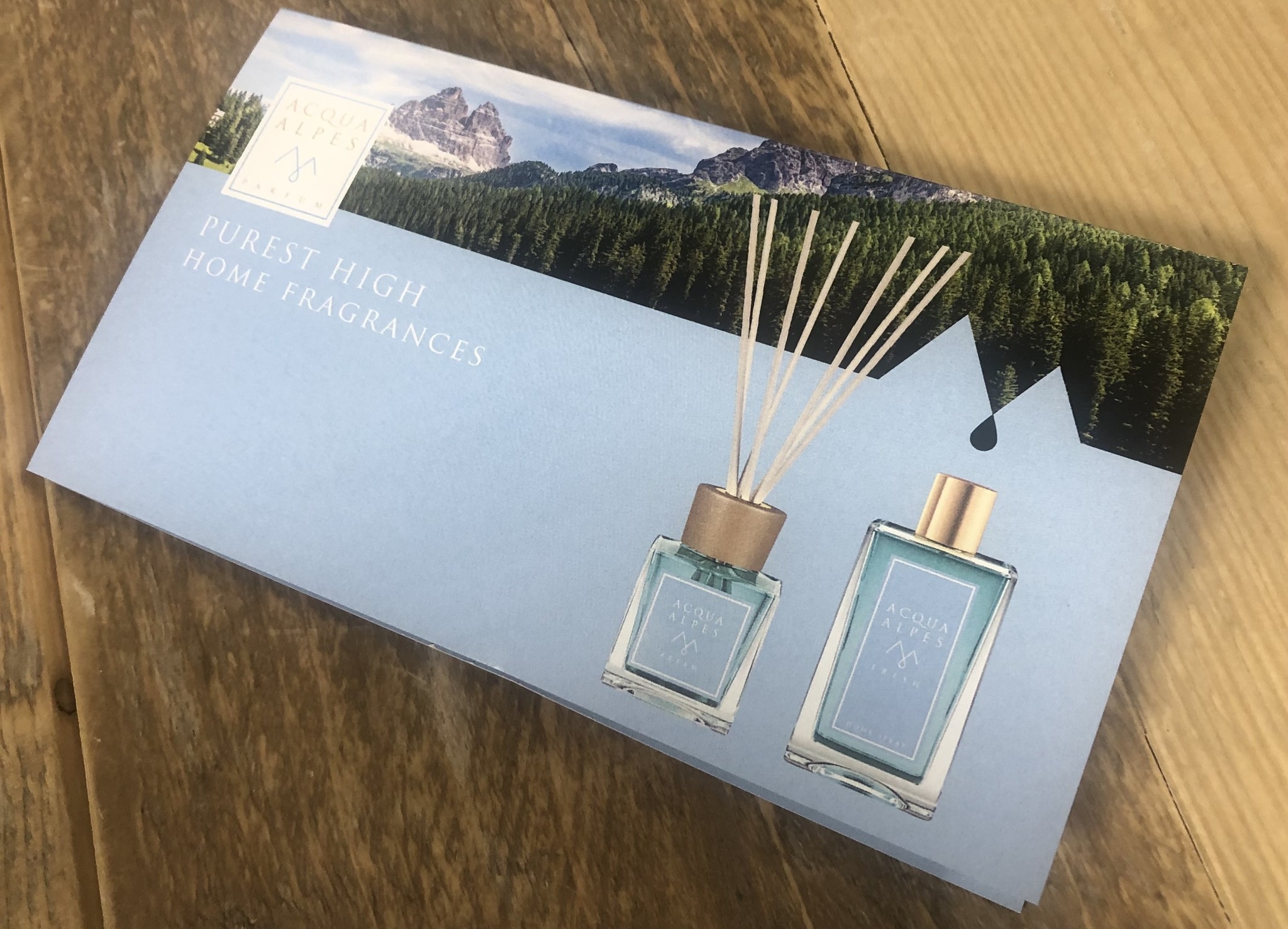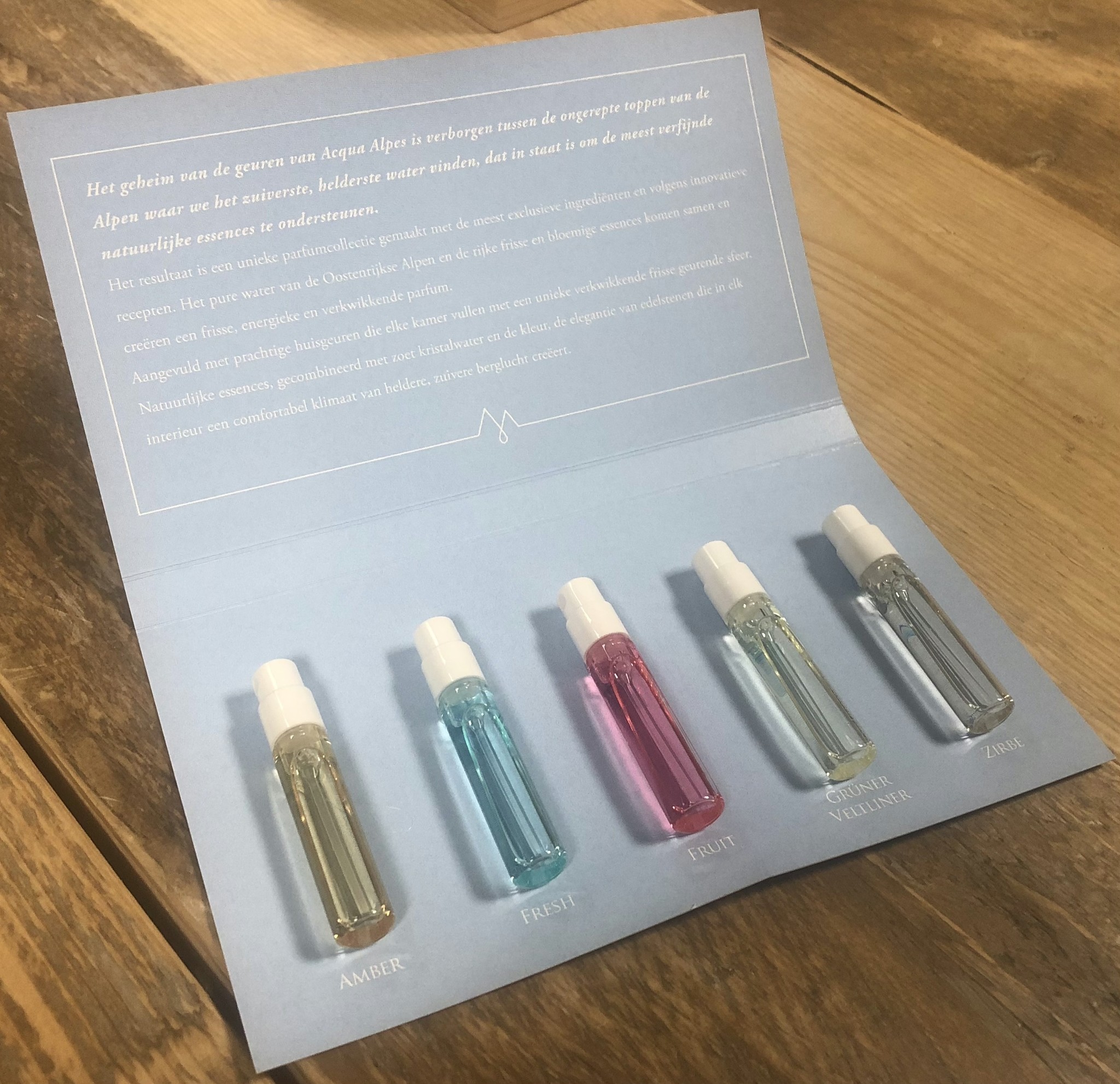 Deze samplekaart bevat de 5 homegeuren uit de Acqua Alpes collectie. Ideaal om te testen welke geur bij jou past.